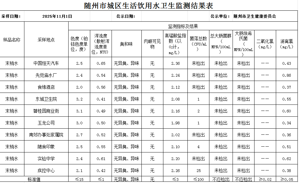 【生活用水監測信息.圖表】11.1隨州市城區生活飲用水衛生監測結果公示