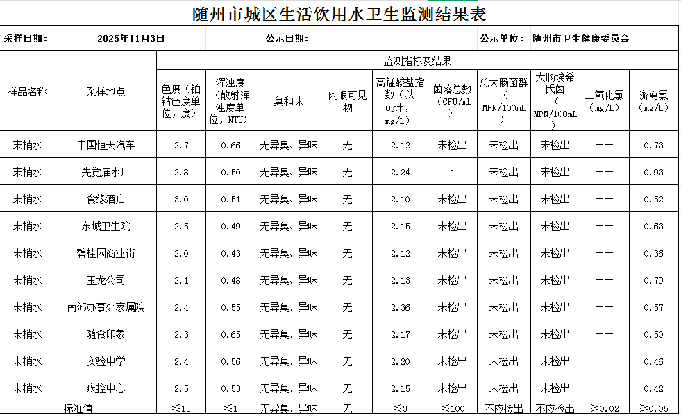 【生活用水監(jiān)測信息.圖表】11.3隨州市城區(qū)生活飲用水衛(wèi)生監(jiān)測結(jié)果公示