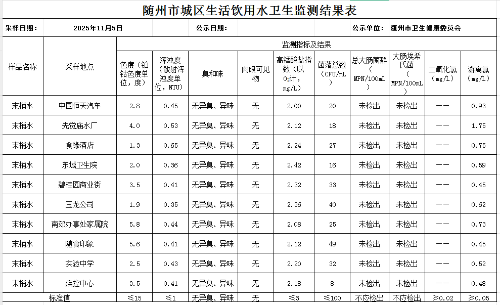 【生活用水監測信息.圖表】11.5隨州市城區生活飲用水衛生監測結果公示