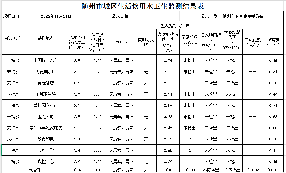 11.11隨州市城區(qū)生活飲用水衛(wèi)生監(jiān)測結(jié)果公示