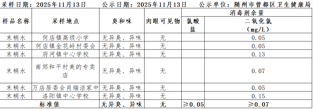 2025年11月13日曾都區鎮級生活飲用水衛生監測結果公示