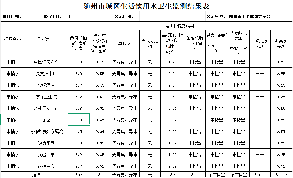 11.12隨州市城區(qū)生活飲用水衛(wèi)生監(jiān)測(cè)結(jié)果公示