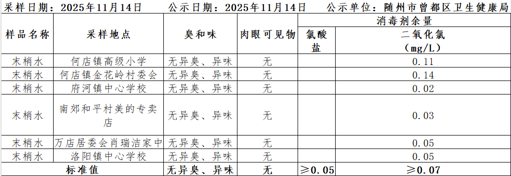 2025年11月14日曾都區鎮級生活飲用水衛生監測結果公示