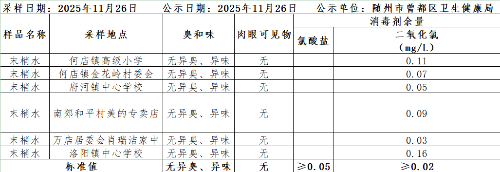 2025年11月26日曾都區鎮級生活飲用水衛生監測結果公示