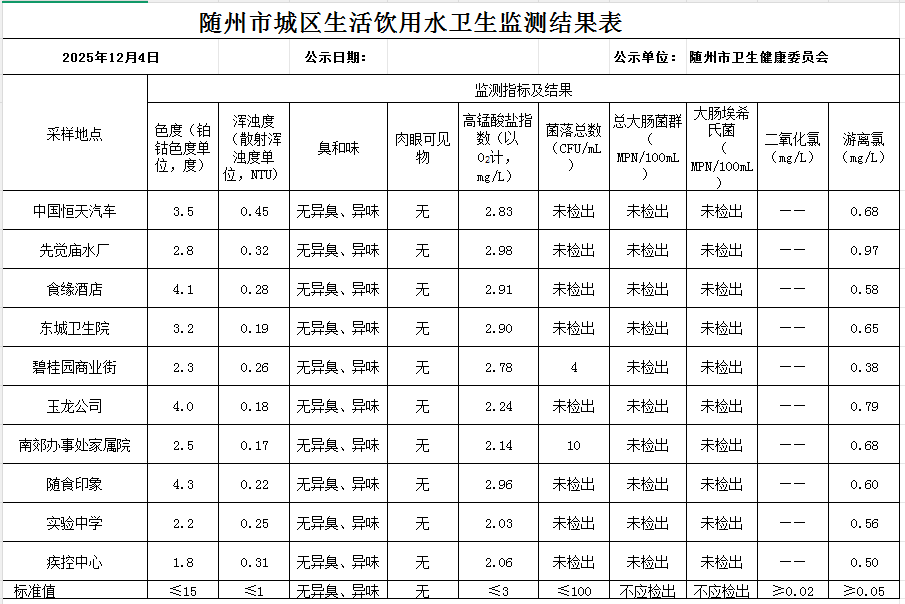 12.4隨州市城區(qū)生活飲用水衛(wèi)生監(jiān)測(cè)結(jié)果公示