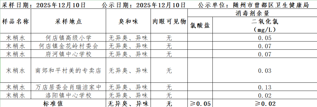 2025年12月10日曾都區(qū)鎮(zhèn)級生活飲用水衛(wèi)生監(jiān)測結(jié)果公示