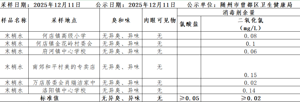 2025年12月11日曾都區鎮級生活飲用水衛生監測結果公示