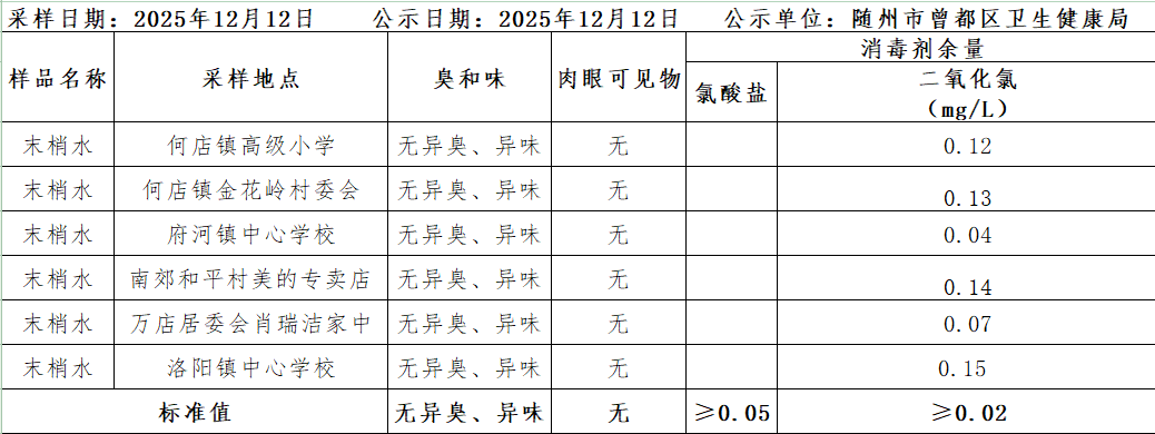 2025年12月12日曾都區(qū)鎮(zhèn)級(jí)生活飲用水衛(wèi)生監(jiān)測(cè)結(jié)果公示
