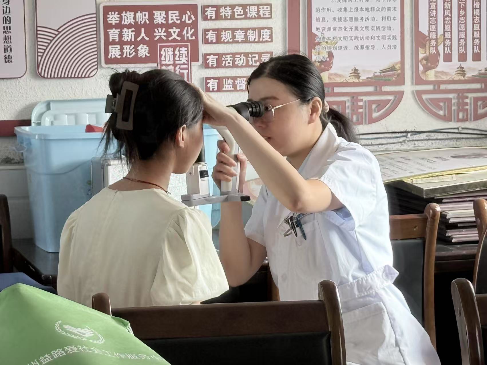 醫療志愿服務隊的醫生們為孩子們逐一進行視力檢測、眼病篩查,細致記錄每個孩子的眼部狀況,還結合篩查結果向家長講解暑期護眼要點,比如控制電子產品使用時長、保持正確讀寫姿勢等。一位陪同孩子檢查的奶奶說:“平時忙農活顧不上帶娃去城里檢查,這次在家門口就能做篩查,還有社工幫忙照看,真是太方便了。”