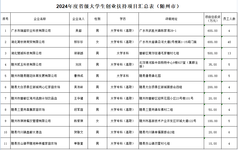 根據《關于開展2024年度大學生創業扶持項目申報工作的通知》(鄂人社函〔2024〕1號)精神,參照項目初選評審標準,綜合項目實地察看情況,從創新引領、帶動就業、項目團隊、發展現狀和前景等,經綜合評審,確定了擬推薦申報2024年度省級大學生創業扶持項目(名單附后),現進行5日公示,歡迎社會各界進行監督。如對所公示情況有異議,請向市勞動就業服務中心反映。