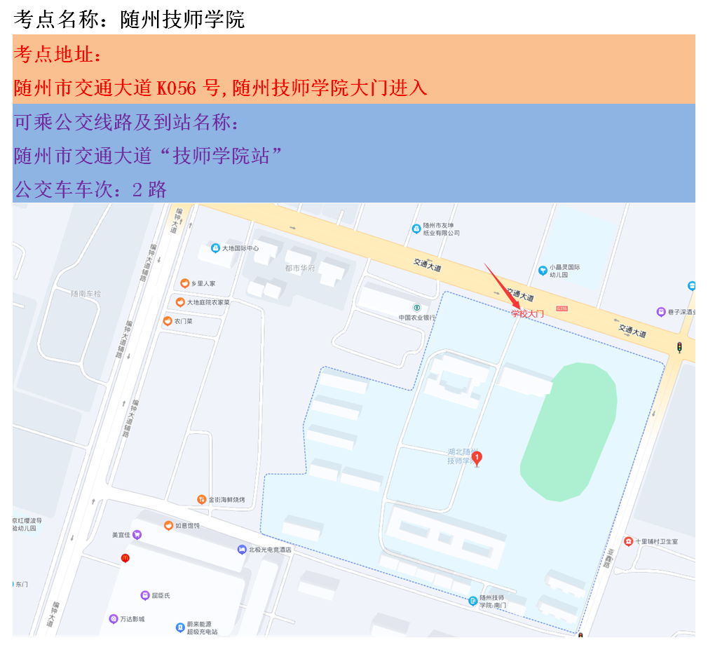 本次考試考點設在隨州技師學院,請各位考生對照準考證上的考點信息提前熟悉考點地址和交通路線,以免走錯考點,耽誤考試。隨州技師學院未設有停車場,建議考生搭乘公共交通工具參加考試,考試期間考點實行封閉管理,陪考人員和私家車嚴禁進入學校。提倡獨立赴考,送考、陪考人員不得在考點周圍聚集。請廣大考生多預留出行時間,建議至少提前90分鐘到達考點,做好考試準備。