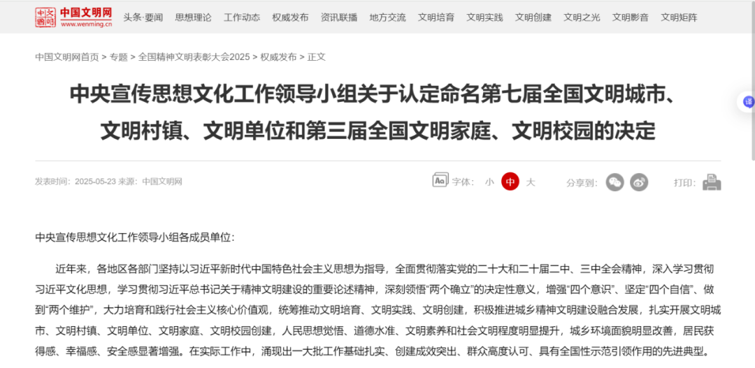5月23日,全國精神文明建設表彰大會在北京召開。中央宣傳思想文化工作領導小組決定,授予202個城市(區)全國文明城市(區)稱號,授予3316個村鎮全國文明村鎮稱號,授予4688個單位全國文明單位稱號,授予798戶家庭全國文明家庭稱號,授予890所學校全國文明校園稱號。其中,隨縣尚市鎮中心小學獲評全國文明校園稱號,也是隨縣第一所全國性文明校園。