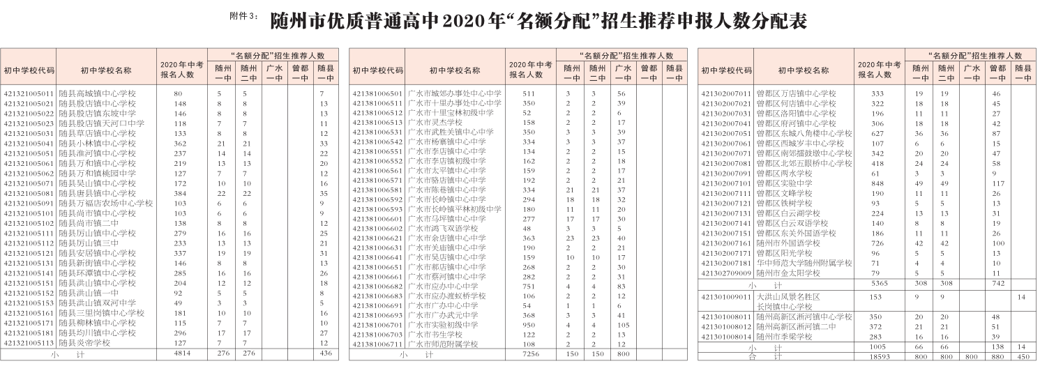 隨州市優質普通高中2020年“名額分配”招生推薦申報人數分配表