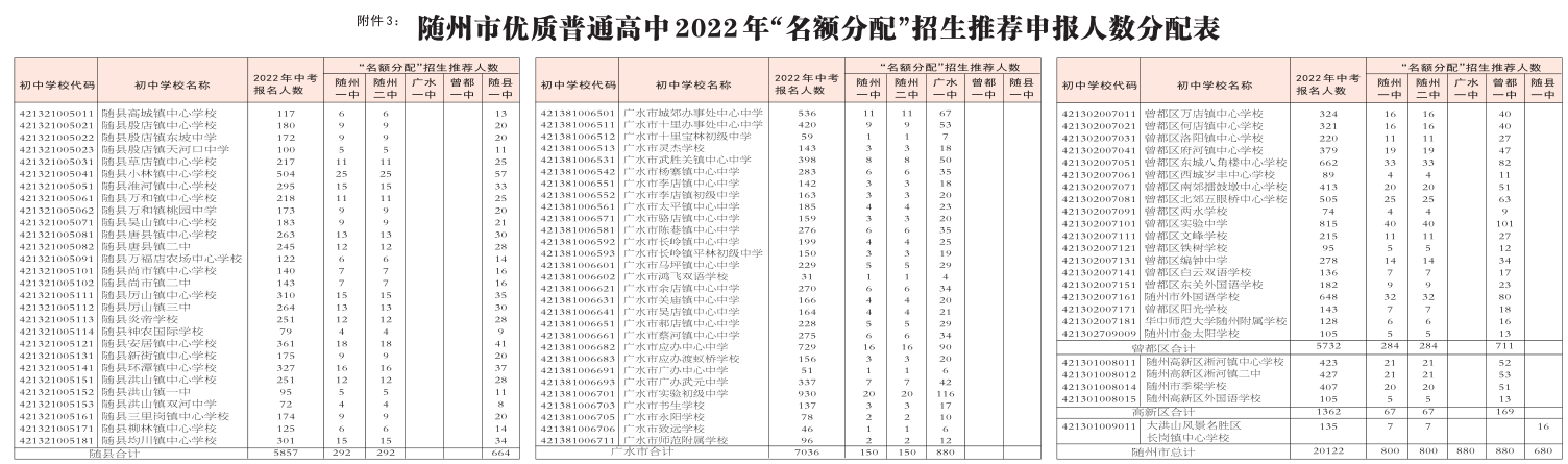 隨州市優(yōu)質(zhì)普通高中2022年“名額分配”招生推薦申報人數(shù)分配表