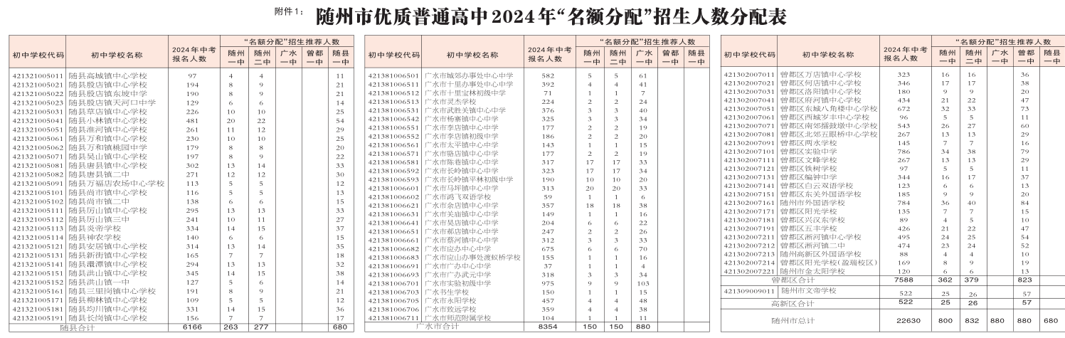 隨州市優質普通高中2024年“名額分配”招生人數分配表