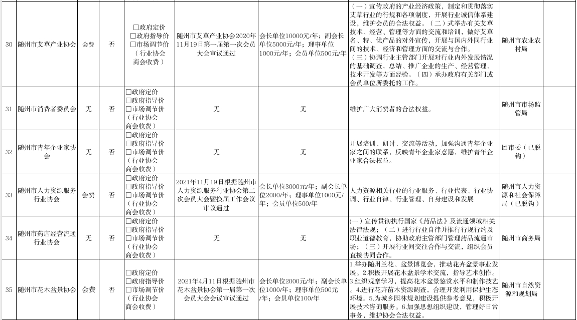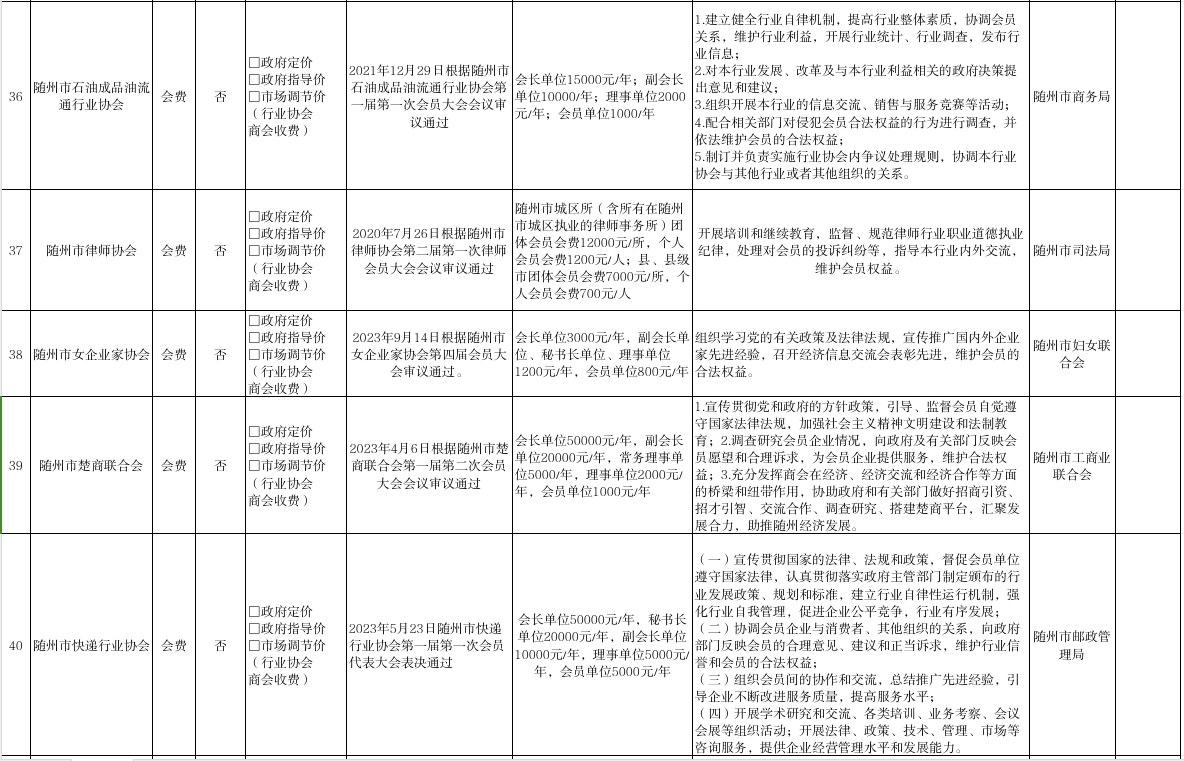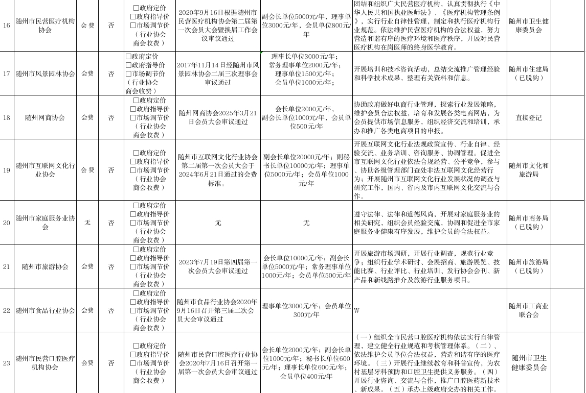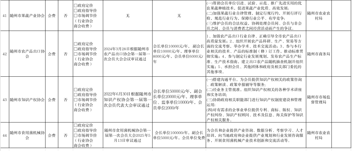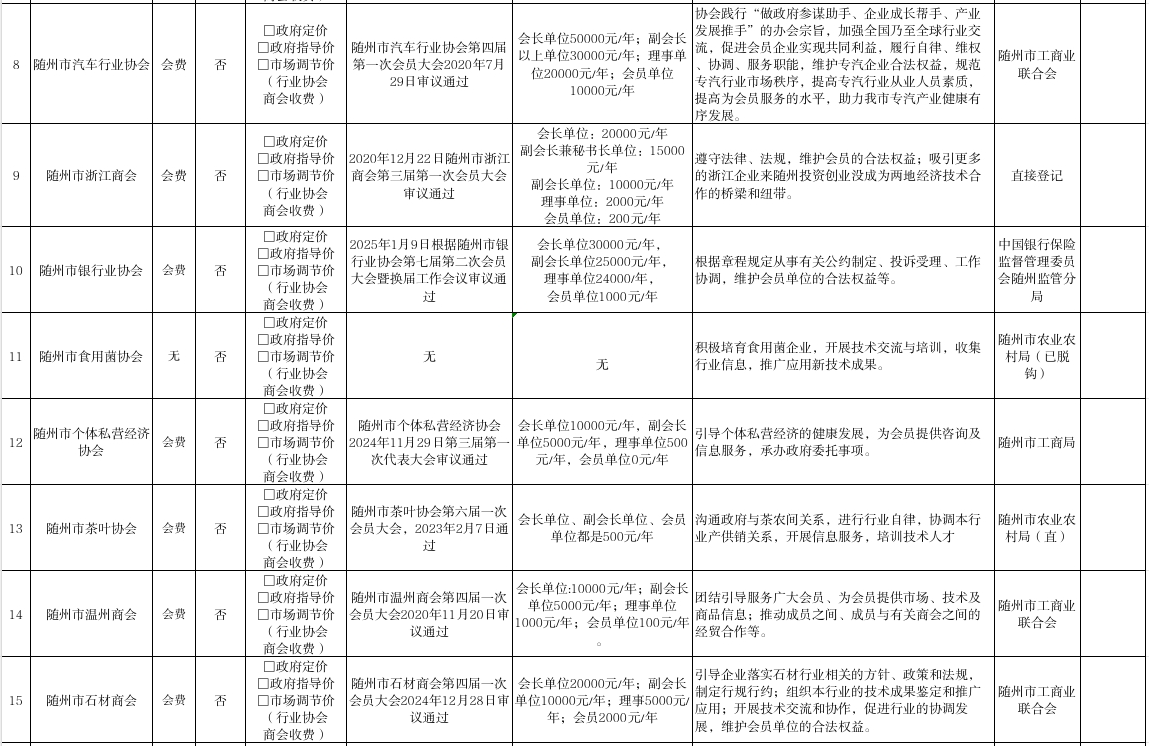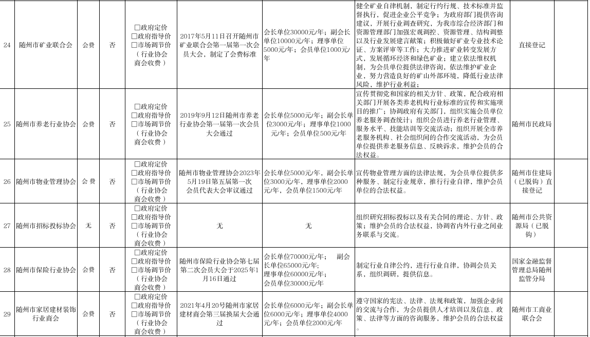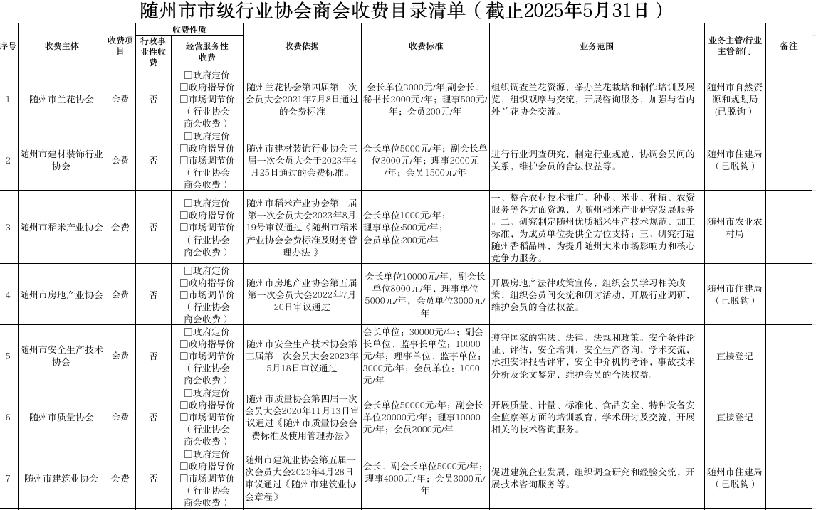 隨州市市級行業協會商會收費目錄清單(截止2025年5月31日)