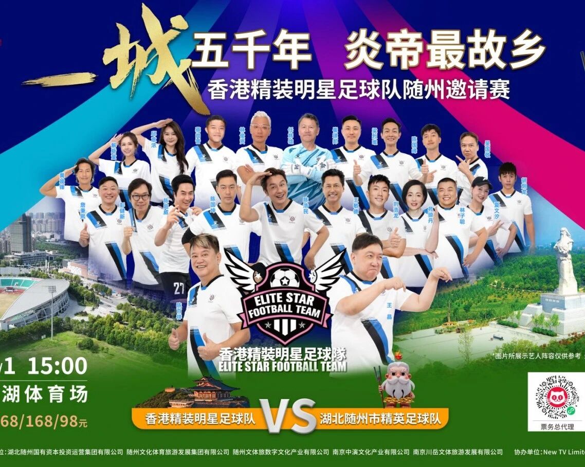 11月1日15:00,香港精裝明星足球隊將應邀蒞臨隨州市濱湖體育場,與湖北隨州市精英足球隊進行友誼賽。擬邀由陳百祥、王晶、陳浩民等藝人組成的明星隊伍(以實際到場為準),以“神韻隨州 一見鐘情”為主題,為市民獻上一場體育與文藝交相輝映的全民盛宴。