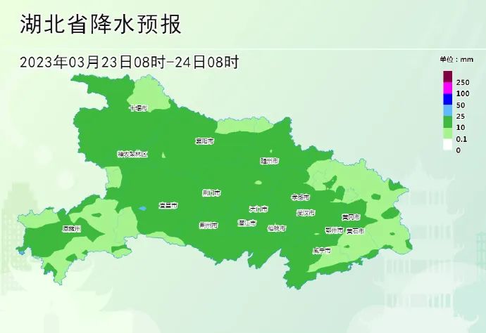 23晚上到24日白天:全省陰天有小雨,鄂東南局部有中雨。