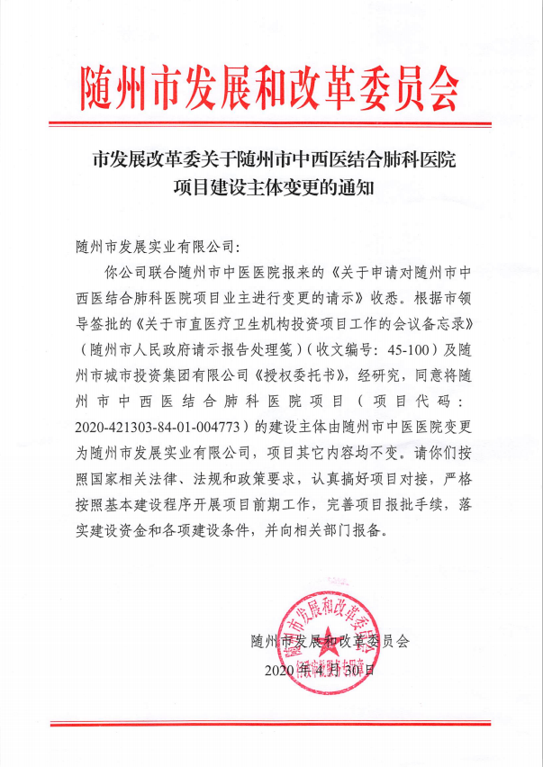 市發展改革委關于隨州市中西醫結合肺科醫院項目建設主體變更的通知