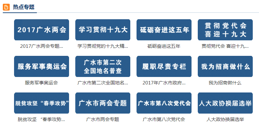 2017年廣水政府門戶網(wǎng)站維護專欄專題11個,分別是廣水兩會專題報道、學(xué)習貫徹黨的十九大精神、砥礪奮進這五年、服務(wù)軍事奧運會、脫貧攻堅“春季攻勢”、政府部門履職盡責等。其中廣水兩會專題報道、學(xué)習貫徹黨的十九大精神、推進義務(wù)教育均衡發(fā)展、精準扶貧不落一人等4個專題還在持續(xù)更新。全年解讀發(fā)布信息127條,回應(yīng)公眾關(guān)注熱點或重大輿情數(shù)量1件。全年收到陽光信訪、市長信箱留言438條,辦結(jié)438條。開展“我為黨代會建言獻策征文”等意見征集6期,開展“關(guān)于市民網(wǎng)絡(luò)安全意識的網(wǎng)上調(diào)查”、“關(guān)于市民體育運動情況及社區(qū)體育設(shè)施的調(diào)查”等在線調(diào)查6期。