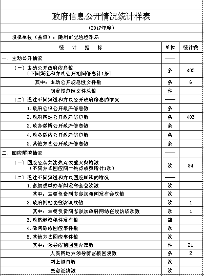 (三)完善政府信息公開載體。2017年,市交通運輸局積極按照網站普查要求,將門戶網站改版、政府信息發布作為年度重點工作,提高政府信息辦理效率和水平。按照要求對市交通運輸局網站進行優化調整,增強了政府信息公開功能。針對省政府辦公廳對我局網站存在問題的通報,我局加強整改,對隨州市政府網站交通版塊政府信息公開各欄目進行了添加完善。