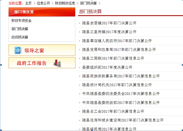 ????(一)財(cái)政預(yù)決算信息公開(kāi)。隨縣人民政府網(wǎng)站“財(cái)政資金”專(zhuān)欄已公開(kāi)2018年縣級(jí)政府預(yù)算和部門(mén)預(yù)算、2017年縣級(jí)政府決算和部門(mén)決算。除涉密部門(mén)外,縣直部門(mén)均已公開(kāi)2018年部門(mén)預(yù)算及2017年部門(mén)決算,實(shí)現(xiàn)縣級(jí)預(yù)算單位預(yù)決算公開(kāi)全覆蓋。嚴(yán)格按照上級(jí)要求,進(jìn)一步細(xì)化預(yù)算公開(kāi)內(nèi)容,建立健全預(yù)決算公開(kāi)統(tǒng)計(jì)和督查工作機(jī)制,定期公開(kāi)預(yù)算執(zhí)行情況等相關(guān)信息,做到公開(kāi)內(nèi)容全面、真實(shí)、完整,形式規(guī)范。2018年全縣共發(fā)布財(cái)政預(yù)稅收信息210余條。