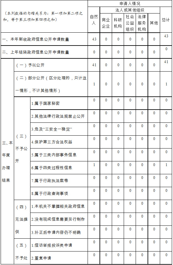 2022年,我局共受理政府信息依申請公開43件,2021年度結(jié)轉(zhuǎn)0件,本年度共辦結(jié)43件,結(jié)轉(zhuǎn)下年度辦理0件,43份答復(fù)中,予以公開的41件,部分公開的1件,不予公開的1件,無法提供的0件,不予處理的0件。