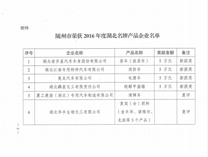 2016年,全市上下認真貫徹落實國務院《質量發展綱要》,狠抓供給側結構性改革和質量保障能力建設,不斷強化質量發展措施,大力實施名牌戰略,取得了一定成效。我市湖北省齊星汽車車身股份有限公司等6家企業生產的8種產品榮獲2016年度湖北名牌產品稱號。為進一步推動名牌戰略的實施,引導和鼓勵企業爭創名牌名標,經研究,市政府決定對榮獲2016年度湖北名牌產品的6家企業予以通報,并對新獲得湖北名牌產品的湖北省齊星汽車車身股份有限公司、湖北江南專用特種汽車有限公司、奧龍汽車有限公司、湖北犇星化工有限責任公司4家企業各獎勵人民幣5萬元。