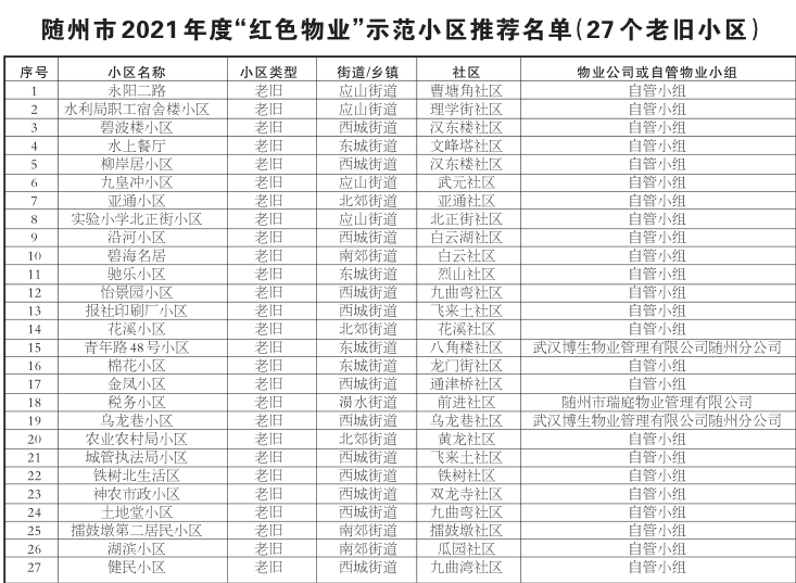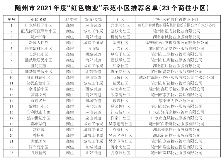 為了高質(zhì)量完成2021年隨州市《政府工作報(bào)告》“十件實(shí)事”確定的50個(gè)“紅色物業(yè)”示范小區(qū)創(chuàng)建工作目標(biāo),各地認(rèn)真貫徹落實(shí)市委、市政府《隨州市“紅色物業(yè)”拓面提質(zhì)工作實(shí)施方案》(隨辦發(fā)電〔2021〕10號(hào))文件精神,堅(jiān)持黨建引領(lǐng)、示范帶動(dòng)、全域推進(jìn)、共建共治,扎實(shí)推進(jìn)城市住宅小區(qū)物業(yè)管理全覆蓋和品質(zhì)提升工作,取得了明顯成效。近日,市委組織部、市住建局、市民政局聯(lián)合進(jìn)行了隨州市2021年度“紅色物業(yè)”示范小區(qū)考評(píng)驗(yàn)收。經(jīng)自評(píng)申報(bào)、初評(píng)推薦、集中驗(yàn)收、部門復(fù)核和驗(yàn)收小組會(huì)議審議等程序,現(xiàn)將隨州市2021年度“紅色物業(yè)”示范小區(qū)推薦名單(50個(gè))予以公示,公示時(shí)間為2022年5月13日至2022年5月18日。如有意見,請(qǐng)?jiān)诠酒趦?nèi)以電話、傳真、電子郵箱或信函等方式向隨州市委黨建工作指導(dǎo)小組辦公室(信函以到達(dá)日郵戳為準(zhǔn))反映。反映情況需實(shí)事求是,要提供具體線索或事實(shí)依據(jù),提倡實(shí)名反映問題。