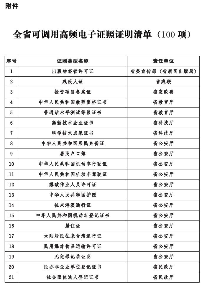 (一)加強(qiáng)電子證照共享調(diào)用,推進(jìn)“免提交”方式。豐富我省可調(diào)用證照種類(lèi),及時(shí)發(fā)布電子證照清單并迭代更新。在已推出的51項(xiàng)高頻證照應(yīng)用的基礎(chǔ)上,繼續(xù)加快社會(huì)保障卡、駕駛證、行駛證、教師資格證書(shū)等數(shù)據(jù)共享,2022年內(nèi)推動(dòng)100項(xiàng)高頻電子證照證明(見(jiàn)附件)在政務(wù)服務(wù)領(lǐng)域的廣泛應(yīng)用。各地各部門(mén)要認(rèn)真梳理事項(xiàng)材料,對(duì)照100項(xiàng)高頻證照在辦事指南標(biāo)注免提交,優(yōu)化完善政務(wù)服務(wù)業(yè)務(wù)系統(tǒng)與省一體化政務(wù)服務(wù)平臺(tái)的改造和對(duì)接,支持對(duì)已有電子證照自動(dòng)關(guān)聯(lián)獲取,證照材料“免提交”。(省政務(wù)辦牽頭,省政府有關(guān)部門(mén),各市州按職責(zé)分工負(fù)責(zé))