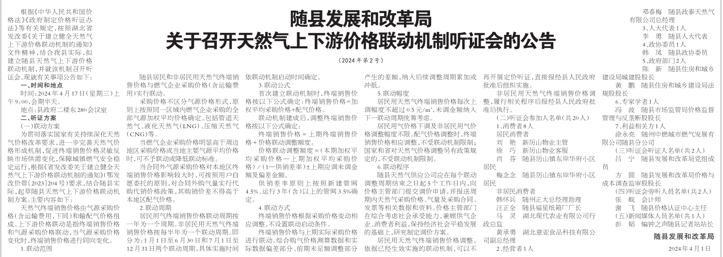 隨縣發展和改革局關于召開天然氣上下游價格聯動機制聽證會的公告
